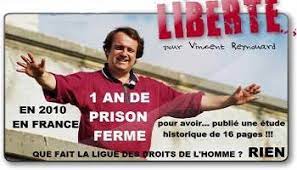 En France, un père de huit enfants, Vincent Reynouard, vient d’être mis en prison à Valenciennes pour un an, sur décision de la cour d’appel de Colmar, parce qu’il a fait savoir, après une longue enquête sur le sujet, qu’il était obligé de donner raison à ceux qui, de leur côté, en France et à l’étranger, ont conclu de leurs propres recherches que, pour des raisons d’ordre physique, chimique, architectural, topographique et documentaire, les chambres à gaz nazies n’ont ni existé ni même pu exister.